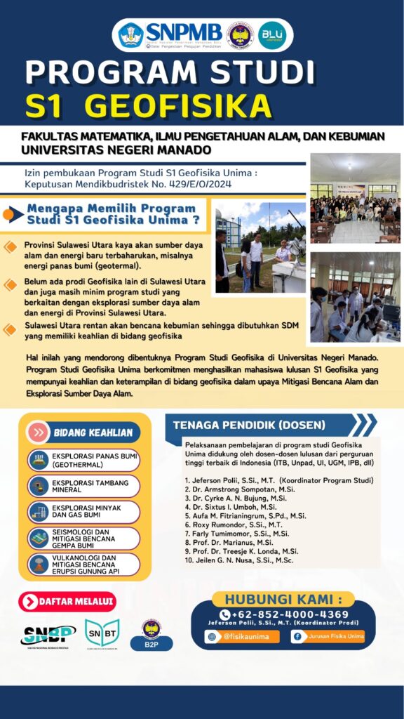 Menjadi program studi yang unggul dan inovatif berdasarkan mapalus dalam pengembangan dan penerapan geofisika terkait ekplorasi sumber daya alam dan mitigasi bencana